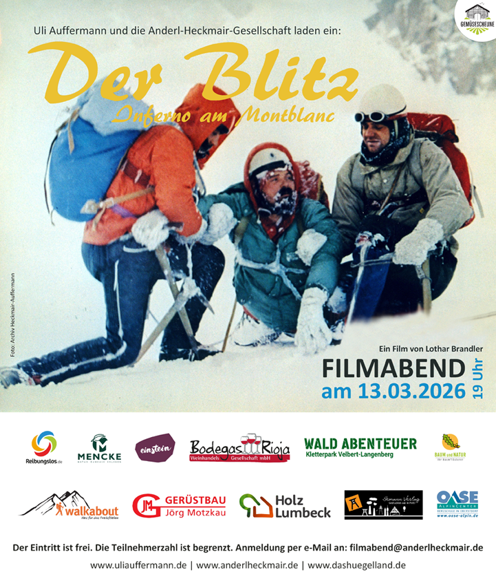 Mit Lothar Brandlers berühmten Film »Der Blitz – Inferno am Montblanc« (1972) laden Uli Auffermann und die Anderl-Heckmair-Gesellschaft am 13.03.2026 erstmals zu einem Filmabend in die Gemüsescheune ein. Los geht es um 19 Uhr. Der Eintritt ist frei. Die Teilnehmerzahl ist begrenzt. Anmeldung erforderlich per e-Mail an: filmabend@anderlheckmair.de